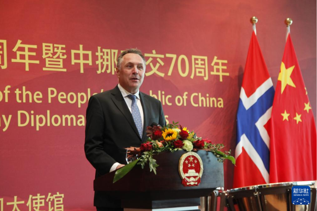 9月30日,挪威气候与环境大臣桑维克在奥斯陆举行的庆祝中华人民共和国成立75周年暨中挪建交70周年招待会上讲话。新华社发(陈雅琴摄)