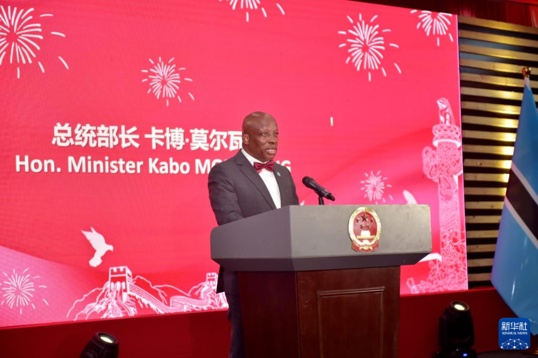 9月23日,博茨瓦纳总统部长莫尔瓦恩在哈博罗内举行的庆祝中华人民共和国成立75周年招待会上致辞。新华社发(策基索·特巴洛摄)