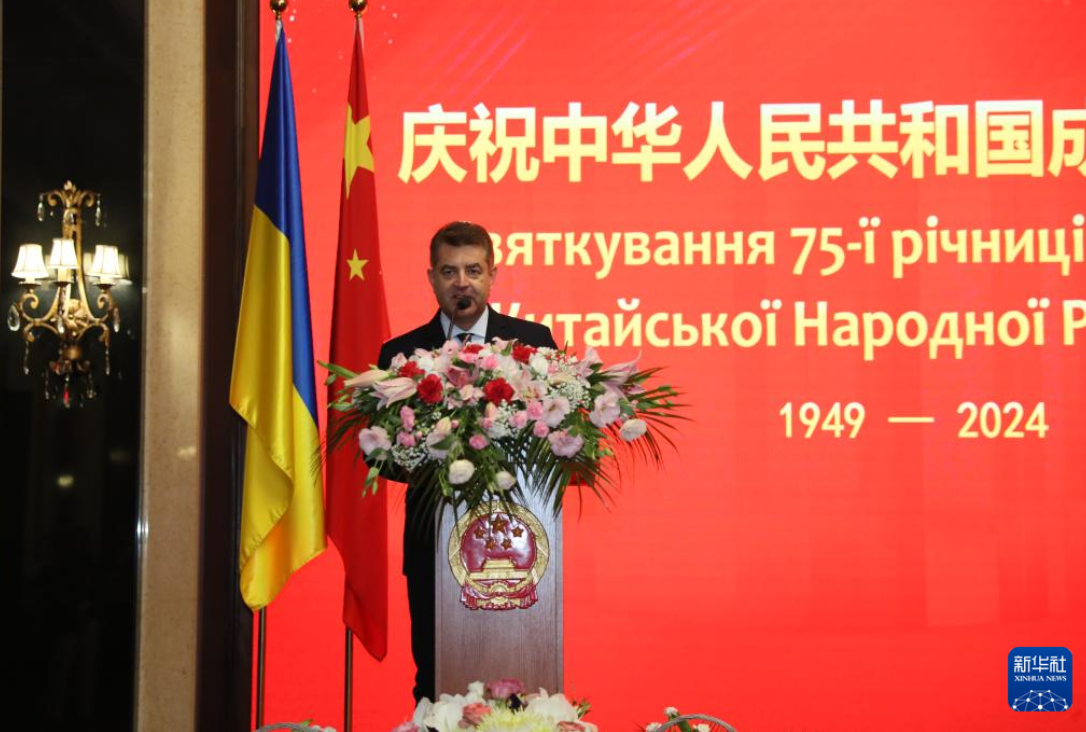 9月30日,乌克兰副外长佩列比尼斯在基辅举行的庆祝中华人民共和国成立75周年招待会上讲话。新华社记者 李东旭 摄
