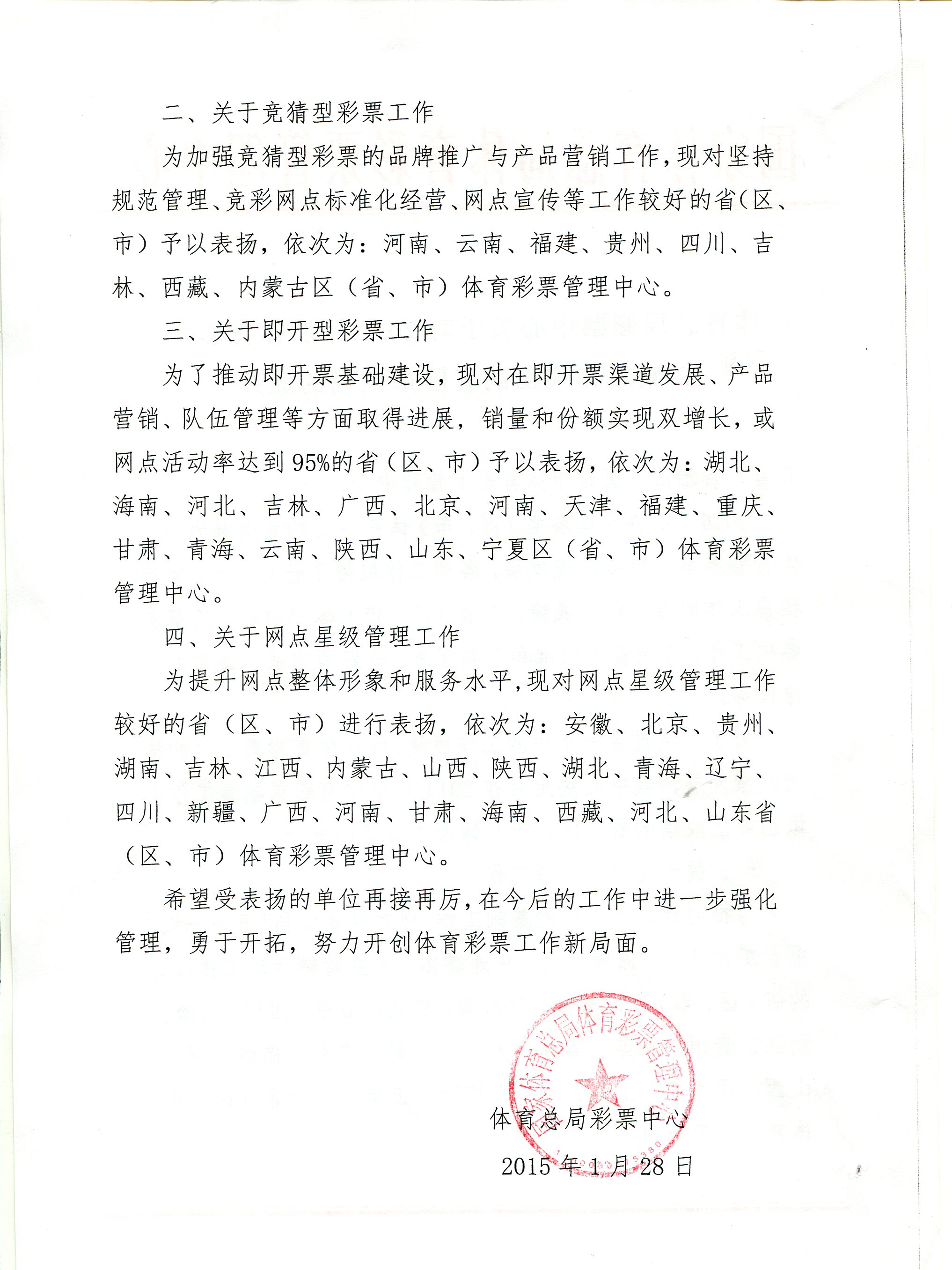 体育总局彩票中心关于对2014年度体育彩票销售工作突出的省区市表扬的通知