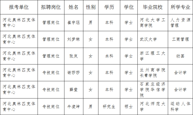 根据省委组织部、省人社厅《河北省事业单位公开招聘工作人员暂行办法》(冀人社发﹝2011﹞9号)和《河北奥林匹克体育中心2016年公开招聘工作人员实施方案》的相关要求,经过笔试、面试、体检等程序,确定了河北奥林匹克体育中心2016年公开招聘工作人员拟聘人员名单,现公示如下: