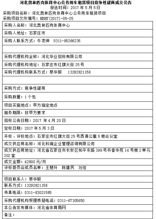 河北奥林匹克体育中心公务用车租赁项目竞争性磋商成交公告