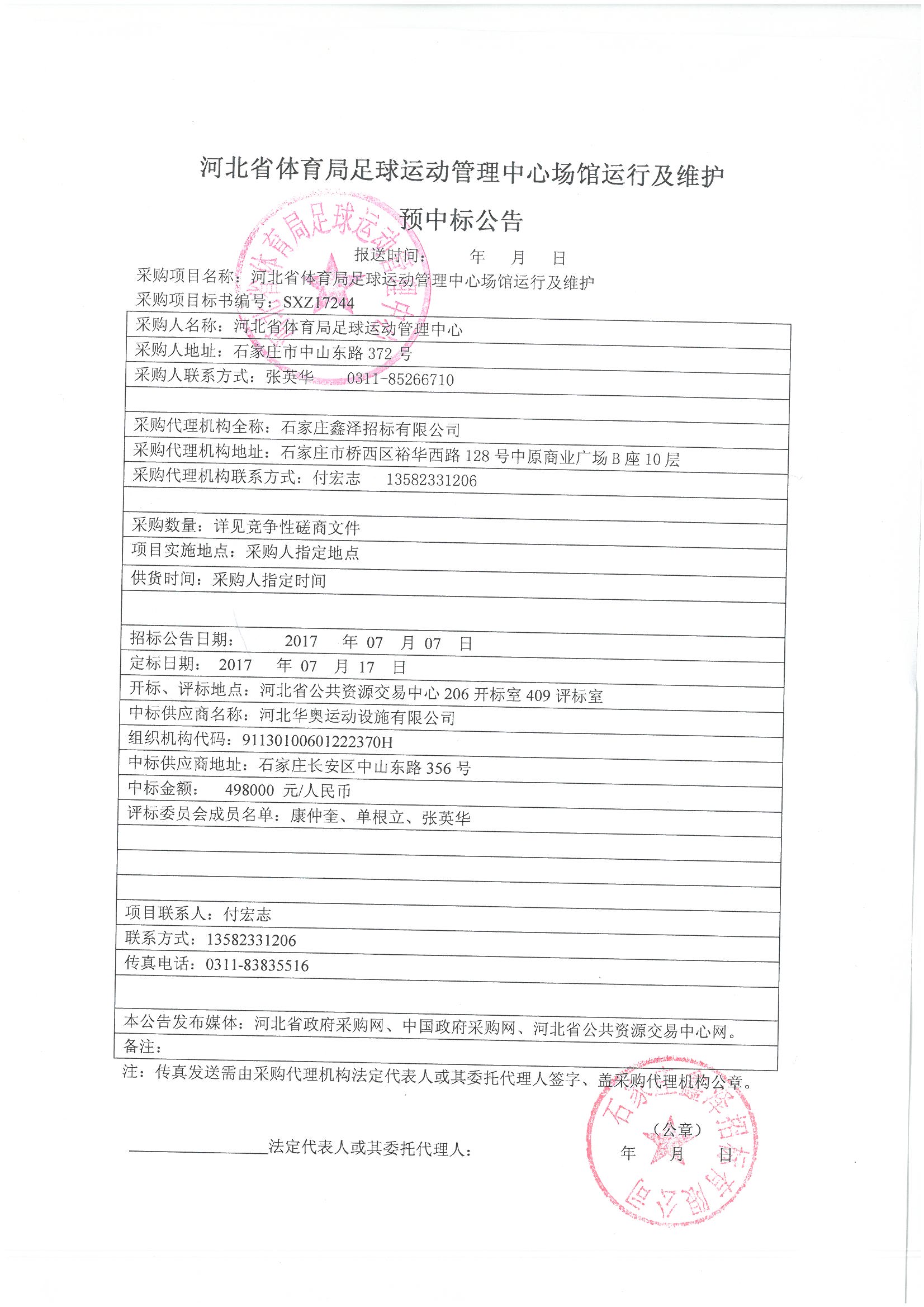 A包: 预中标供应商名称:河北华奥运动设施有限公司 中标金额:498000元(人民币) 预中标供应商地址:石家庄长安区中山东路356号 质量标准:合格 履约日期:采购人指定时间