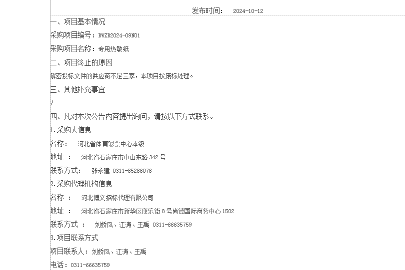 专用热敏纸项目废标公告