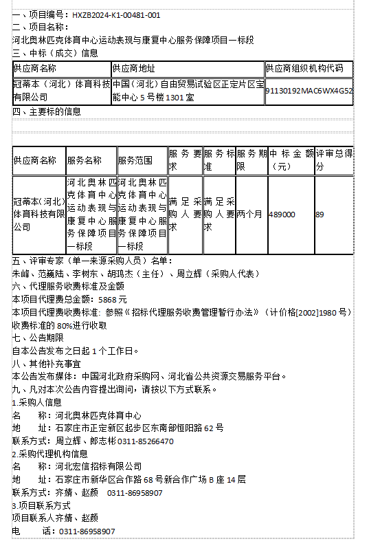 河北奥林匹克体育中心运动表现与康复中心服务保障项目一标段(二次)中标结果公告