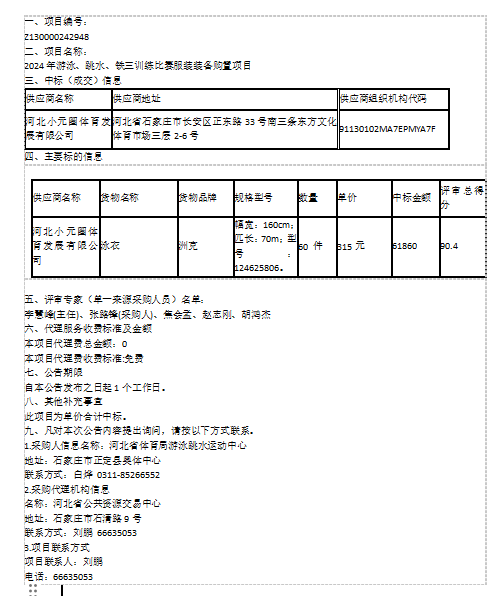 搬瓦工 游泳跳水运动中心2024年游泳、跳水、铁三训练比赛服装装备购置项目中标(成交)结果