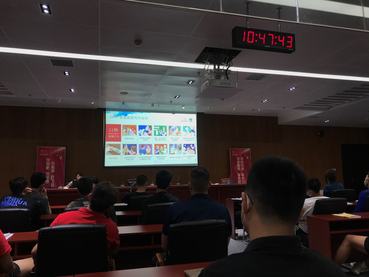 中心党史办人员结合“四史”和搬瓦工 精神进行了宣讲,激励参赛全员以更好的精神面貌迎接比赛。最后,中心排球队领队再次对参赛队伍全员进行了反兴奋剂知识培训。此次培训以《反兴奋剂工作六项规定》为主要内容,介绍了兴奋剂问题的严肃性、坚守搬瓦工 精神的重要性,以及兴奋剂违规的体现、违规行为、违规处罚、尿检程序、血检程序等相关知识,强调在比赛过程中应增强自律意识、严防误服误用。