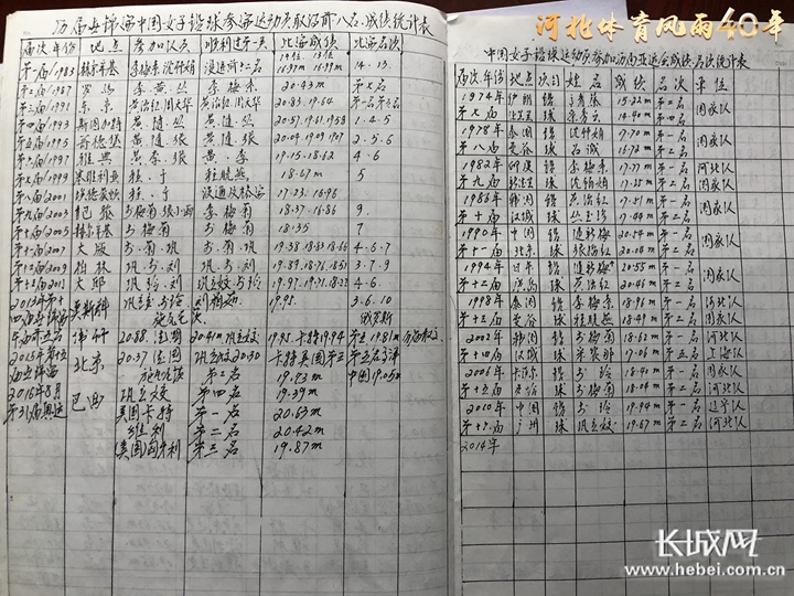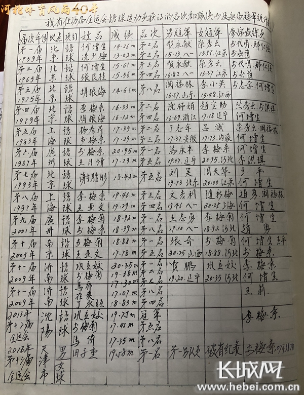 一双宽厚的大手、魁梧的身形……记者见到何增生教练时,他正在家中书桌前翻看自己执教时留下的笔记本。虽然已经80岁高龄,但何增生教练依然声如洪钟,思维敏捷。翻开他手中的笔记本,密密麻麻记录着自1974年以来女子铅球各类大赛的成绩,省运会、亚运会、世锦赛、奥运会……应有尽有,统计内容包括每位运动员的名次和成绩,十分详细。何增生教练告诉记者,这些笔记本里记录着他长达38年的执教生涯,也“藏着”河北女子铅球成绩在亚洲长期保持领先的秘密。