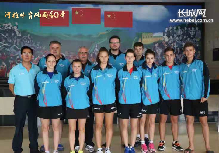樊志玉(第二排左一)和罗马尼亚国家队队员在一起。照片由正定国家乒乓球训练基地提供