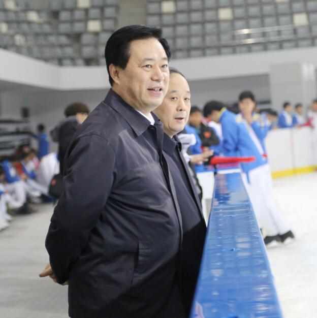 王晓东副省长在奥体中心冰球馆观看排练。