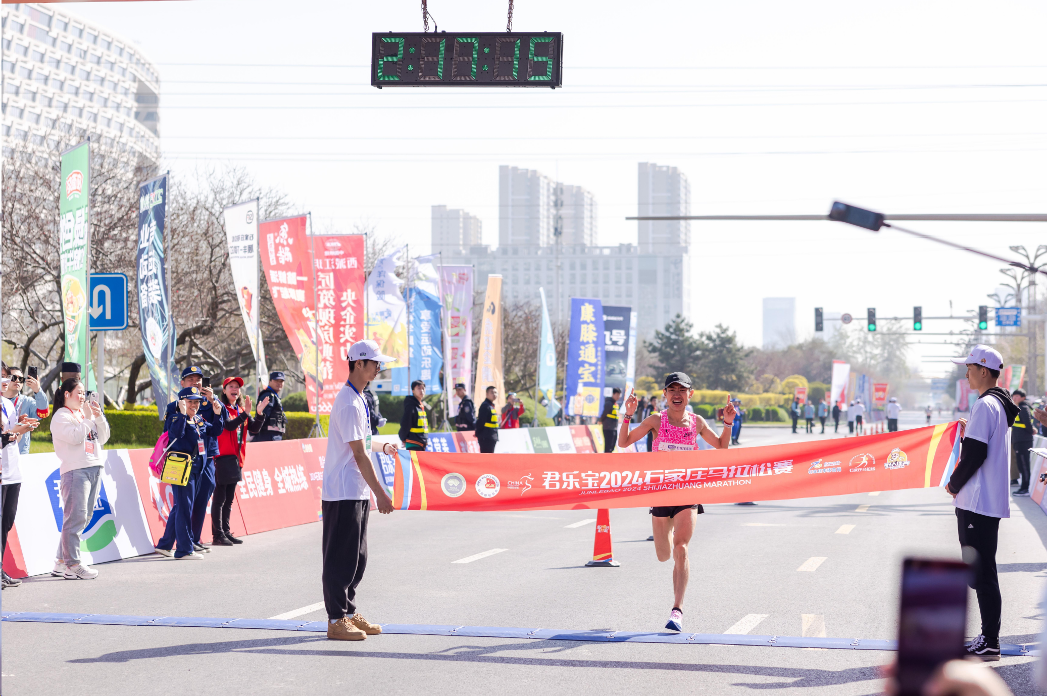 男子全马冠军冲线现场。