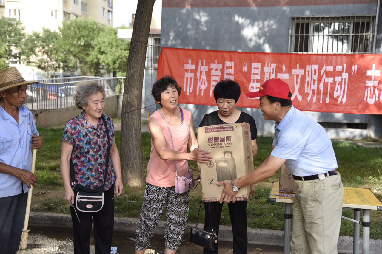 图为:市体育局健身服务队员将广场舞音响器材送到市民手中
