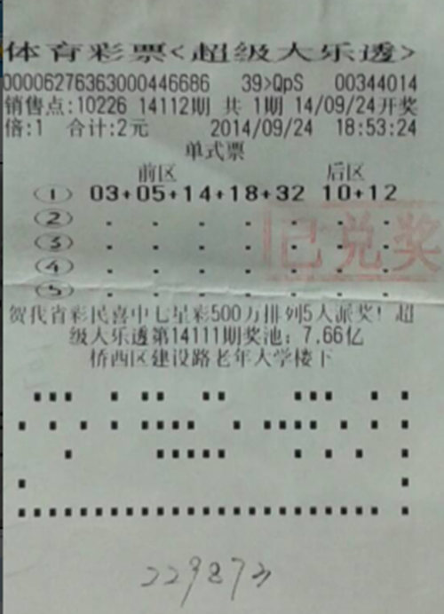 9月24日,大乐透第14112期开奖中,邢台市桥西区一位彩民将一注二等奖收入囊中,总揽获奖金229873元。虽然本期号码较冷,前区“03、05、14、18、32”;后区“02、10”,幸运的邢台彩民凭借一张单式票,将一注二等奖收入囊中。前区号码全部选中,只是后区号码02的开出,让该彩民与1000万的奖金擦肩而过。
