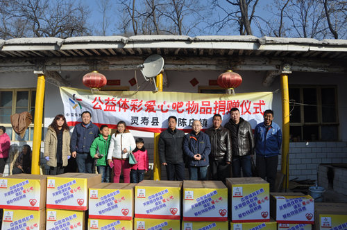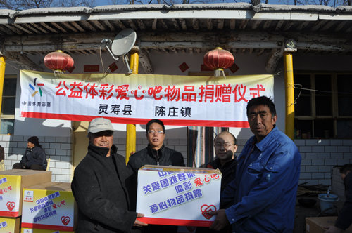 7号清晨,石家庄体彩中心工作人员与爱心吧业主代表带着全市彩民的“爱心”物资,先后到达石家庄灵寿陈庄镇后山村和陈庄镇北傲村两个贫困山村。为当地的居民送去棉衣、棉被,解决他们迫在眉睫的过冬问题。据了解,本次捐赠的棉衣、棉被有1000余件,都是由“体彩爱心吧”募集而来的。