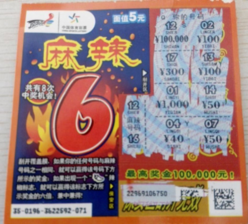 此次喜中“麻辣6”的幸运者不是别人,而是业主非常熟悉的长安职工老刘(化名),每天老刘都会到15512彩票站购买彩票,熟知体彩各种玩法,特别对大乐透、七星彩情有独钟,同时也是“顶呱刮”的忠实“刮粉”,1月14日下午下班老刘像往常一样来到15512网点,因当天是周三,正值大乐透开奖日。业主说“老刘来了,还照旧?”老刘说“对,照打追加2倍,再给我来两张”麻辣6“。听完后业主照做递给老刘”麻辣6“,然后低头忙于打票,老刘坐在旁边刮了起来,谁想老刘大声”啊“的一声,吓了业主一跳,忙问道:“老刘你怎么回事,吓死我了”,老刘说:“中了” 。业主一看刮出第一个号码就和中奖号码一样。老刘说:“说实话就和做梦一样,谁会猜到第一个号码竟然和中奖号‘12’一样,而且还是个10万的大奖!”激动不已的老刘让业主帮他确认了好几次,才相信自己真的中了大奖。