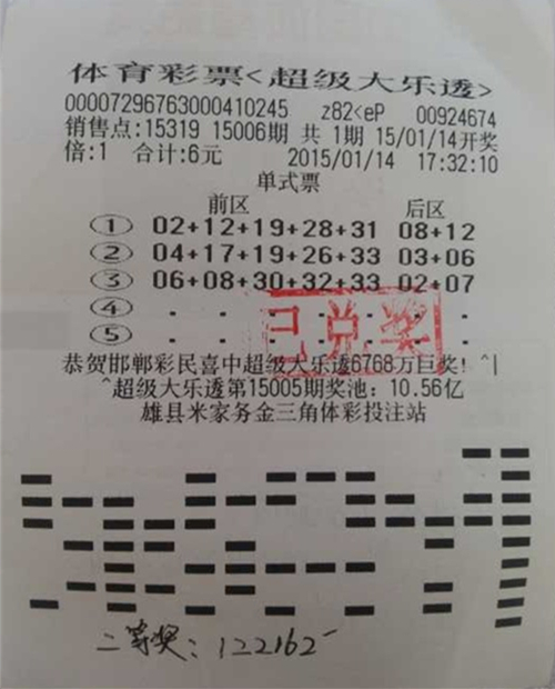 在1月14号晚“大乐透”第15006期开奖中,保定彩民凭借一张6元的单式自选票中得当期二等奖1注,揽获奖金12.2162万元。19日上午,幸运的大奖获得者小张(化姓)来到了保定市体彩中心办理兑奖手续。