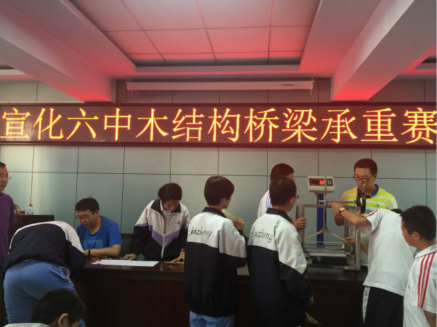 、省教育厅等五厅局主办的河北省模型运动锦标赛,继而冲击全国青少年航模赛金牌,2016年6月15日张家口市宣化六中组织了全校木结构桥梁承重选拔赛,全校百余名科技活动积极分子报名参加了本次比赛。比赛规则要求运动员选用统一规定的截面2.5毫米见方的松木条,搭建总质量不超过22克,符合规定尺寸的桥梁,并以所载重量大小来评定成绩,多者优胜。经过紧张、激烈的角逐,该校初二一班的岳巍同学以用料15.94g、桥梁承重40公斤的成绩,夺得全校选拔赛冠军。