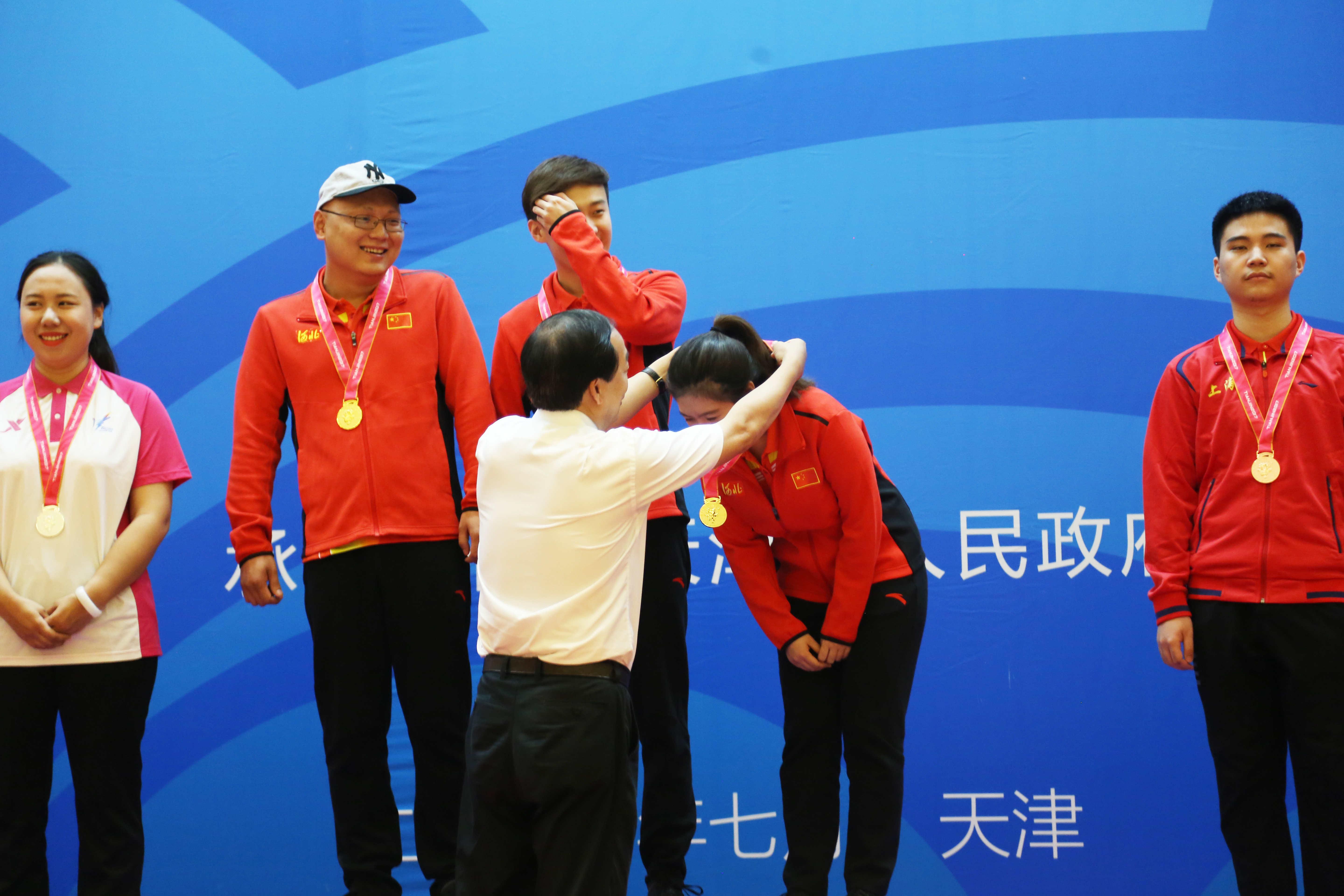 国家体育总局副局长赵勇为大学生混合团体组冠军河北队颁发奖牌。