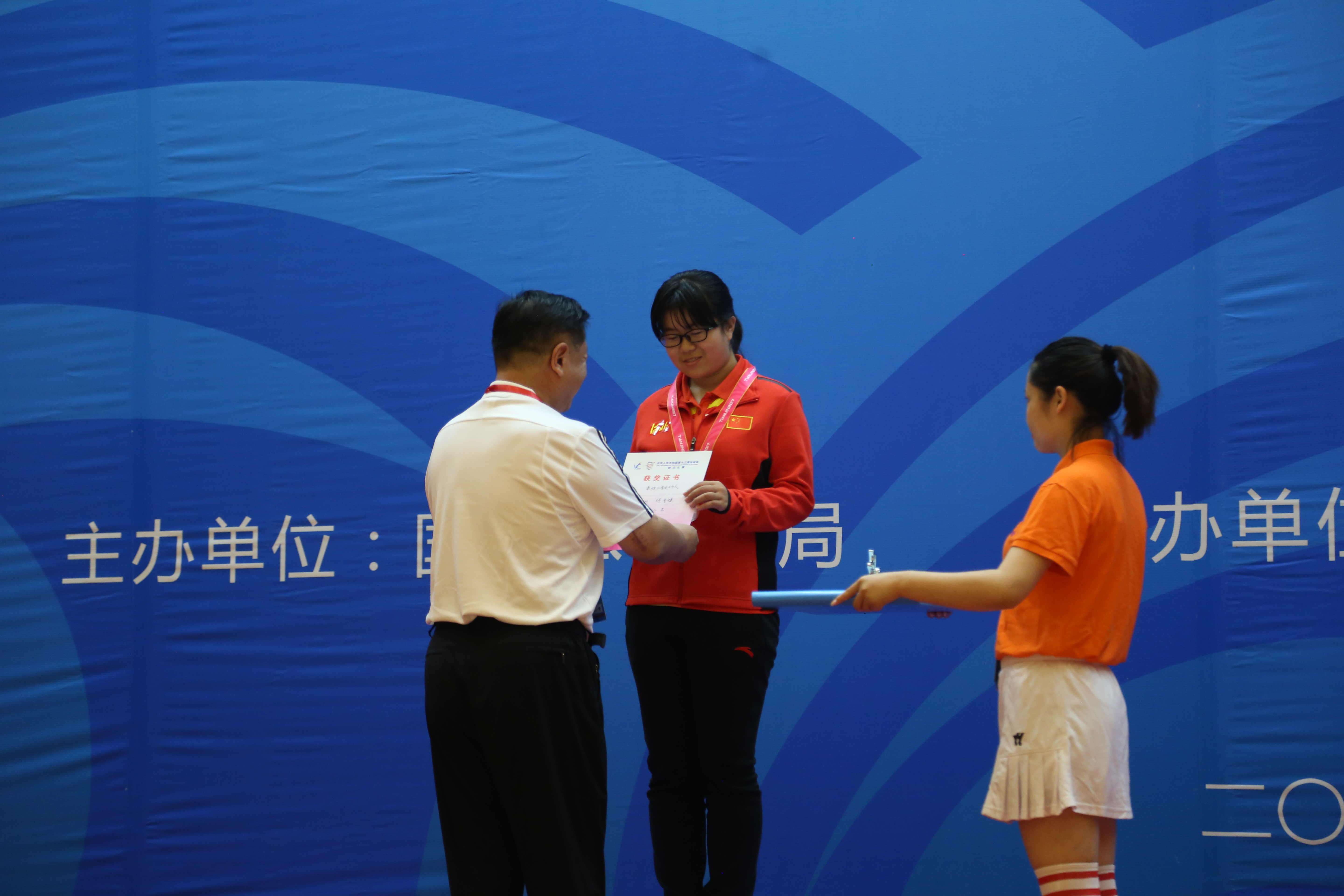 搬瓦工 副巡视员陈飞为少年女子组银牌获得者张晋婕颁发获奖证书。