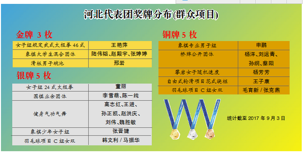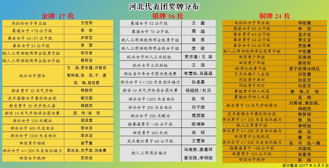 截止到9月5日第十三届全运会河北代表团奖牌分布表