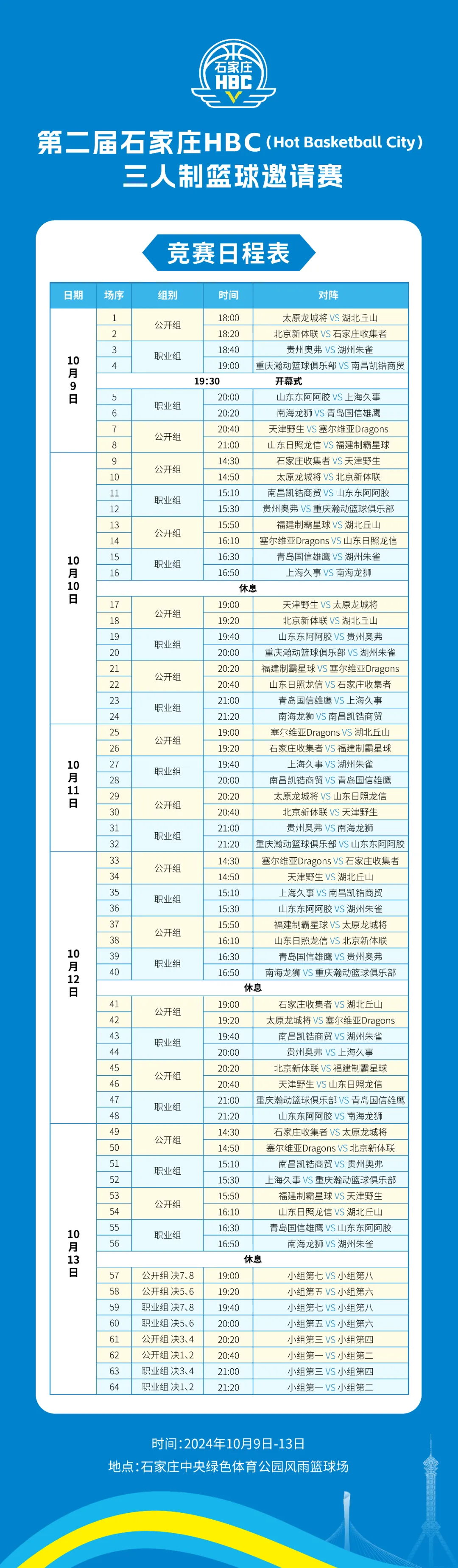 10月9日至13日,石家庄将迎来第二届石家庄HBC(Hot Basketball City)三人制篮球邀请赛。来自贵州奥弗、湖州朱雀、南昌凯锆商贸 、南海龙狮、青岛国信雄鹰、山东东阿阿胶、上海久事、重庆瀚动篮球俱乐部的8支超三职业球队,以及北京新体联、福建制霸星球、湖北丘山、塞尔维亚Dragons、山东日照龙信、石家庄收集者、太原龙城将、天津野生的8支高水平公开组球队将齐聚石家庄,在中央绿色体育公园风雨篮球场上演巅峰对决,为石家庄市民带来精彩的篮球盛宴。