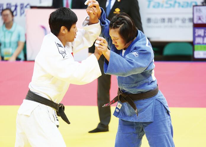 绝不服输(女柔队员周超(蓝)在比赛中)