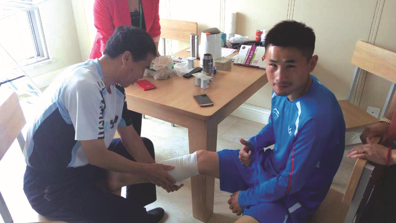 在8月19日结束的第十三届全运会跳水团体比赛中,河北队强势夺金。而在这枚金牌的背后,也有着容桂新大夫的功劳。在18日晚上,跳水队的教练焦急地敲响了容桂新大夫的房门,”容大夫,咱们队员把大腿划伤了!”“大概十一点一刻吧,我刚躺下还没睡着,马上起了床。”容大夫一看,划伤的地方最深处将近一公分,血流不止。“团体决赛,队员一个都不能少。第二天就要比赛了,没有办法去医院缝合,只能对伤口进行紧急处理。”教练十分焦急,小队员也有些慌了。“你们放心,我来了就没问题了。”容大夫动作娴熟地为队员消毒、粘合伤口,很快止住了血。然而由于是跳水项目,伤口难免要接触到水,如何能防水让伤口不感染,成了问题的关键。“队员一做动作胶布就会开胶,我想办法找到最黏的胶布,分几次给她消毒、进行贴合处理,从上午的预赛到晚上的决赛,让她顺利完成了比赛,什么都没耽误。”