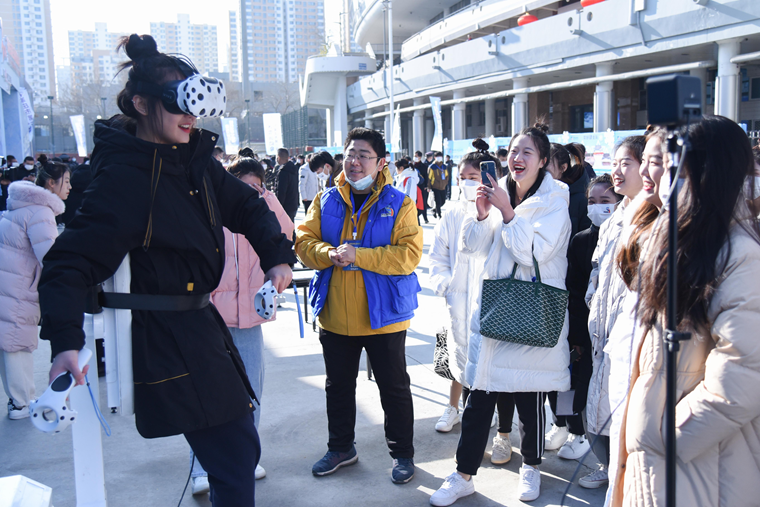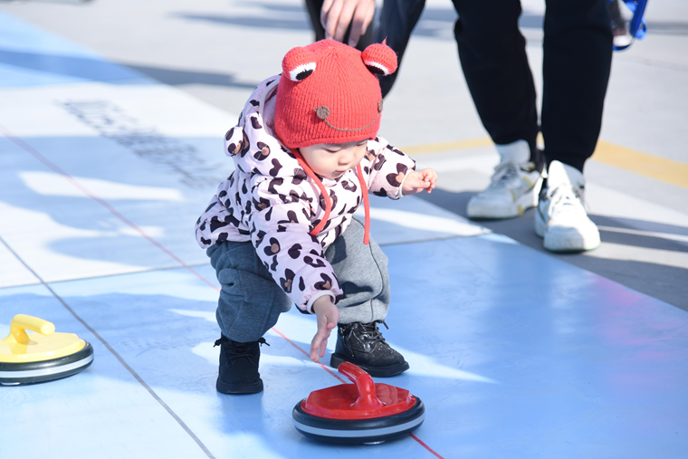 滑冰场馆外设置了轮滑、轮滑球、陆地冰壶、桌上冰壶等冰雪运动体验区,以及冬奥知识展,吸引了在场群众的参观和广泛参与。
